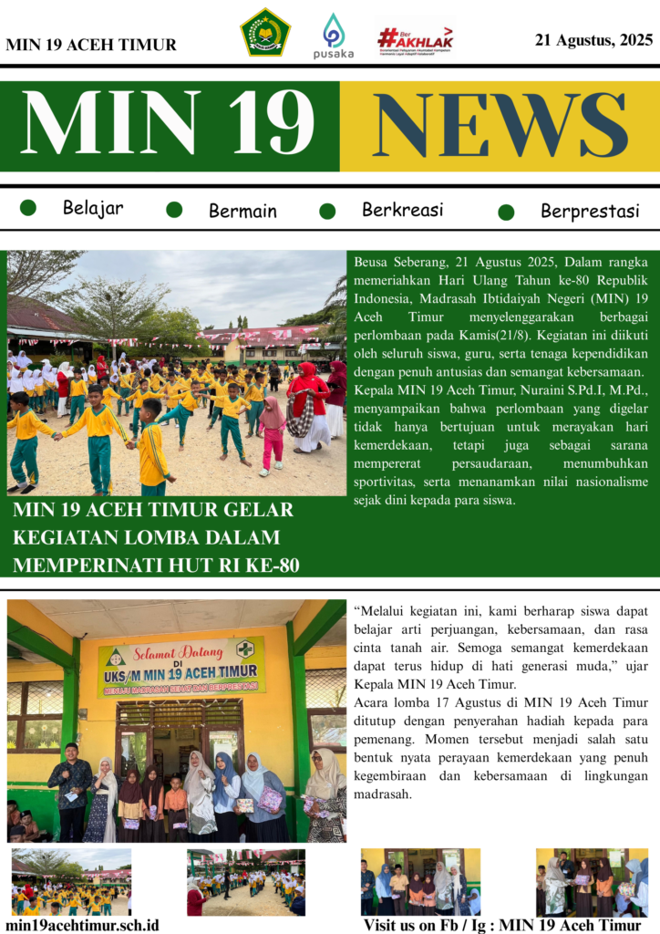Beusa Seberang, 21 Agustus 2025, Dalam rangka memeriahkan Hari Ulang Tahun ke-80 Republik Indonesia, Madrasah Ibtidaiyah Negeri (MIN) 19 Aceh Timur menyelenggarakan berbagai perlombaan pada Kamis(21/8). Kegiatan ini diikuti oleh seluruh siswa, guru, serta tenaga kependidikan dengan penuh antusias dan semangat kebersamaan.
