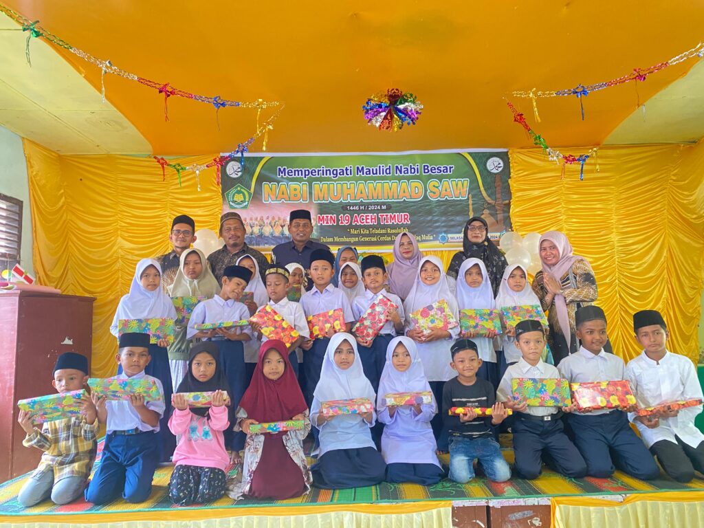 Beusa Seberang, 19 November 2024 merupakan hari yang berbahagia bagi seluruh keluarga besar MIN 19 Aceh Timur. Karena pada hari tersebut diselenggarakan perayaan Maulid Nabi Muhammad SAW Tahun 1446 H. Sebagai momentum yang penting setiap tahunnya seluruh guru dan siswa mempersiapkan acara dengan sebaik mungkin. Khusunya bagi siswa Yatim yang mendapatkan santunan berupa bingkisan dan hadiah sebagai rasa syukur dalam kebersamaan. Peringatan Maulid yang menjadi tradisi untuk berbagi kepada anak yatim menjadi momen penting untuk meningkatkan rasa syukur bagi seluruh guru dan siswa. Penyerahan bingkisan diberikan oleh ibu Nuraini, S.Pd.I, M.Pd, Komite Madrasah bapak Saiful Mulki, S.Sos.I dan Geuchik Gampong Beusa Seberang bapak M. Thayeb. Siswa yatim sangat antusias mendapatkan hadiah dan bingkisan semoga menjadi amal jariyah bagi seluruh guru dan para siswa di MIN 19 Aceh Timur. (Rz)