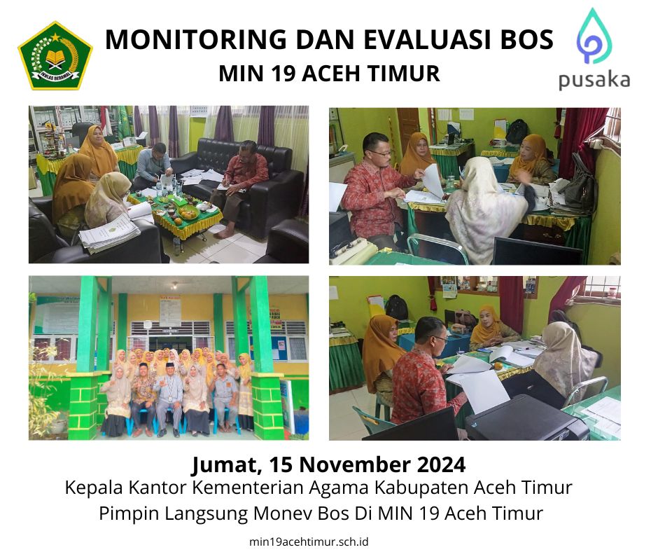 Beusa Seberang, Jumat, 15 November 2024 dilaksanakan Monitoring dan Evaluasi BOS MIN 19 Aceh Timur Tahun 2024. Kegiatan tersebut dipimpin langsung oleh Kepala Kantor Kementerian Agama Kabupaten Aceh Timur, H. Salamina, S.Ag, MA bersama Pelaksana Bagian Keuangan Martunis Anwar S.E. Kehadiran tim disambut langsung oleh Kepala Madrasah Nuraini, S.Pd.I, M.Pd dan di dampingi Bendahara Madrasah Nursiah, S.EI. Kegiatan Monev berlangsung lancar dan kedepannya diharapkan pengelolaan dan laporan BOS MIN 19 Aceh Timur semakin baik lagi. Kegiatan tersebut dilaksanakan di ruangan kepala madrasah dan ruangan bendahara madrasah secara terpisah. Ucapan Terimakasih disampaikan langsung oleh Kepala Madrasah kepada TIM Monev dan selurus guru dan staf yang telah mempersiapkan bahan dan tempat monitoring. Kerjasama dan kekompakan tim menjadi kekuatan madrasah yang harus di jaga dan di tingkatkan untuk kemajuan MIN 19 Aceh Timur. (Rz)