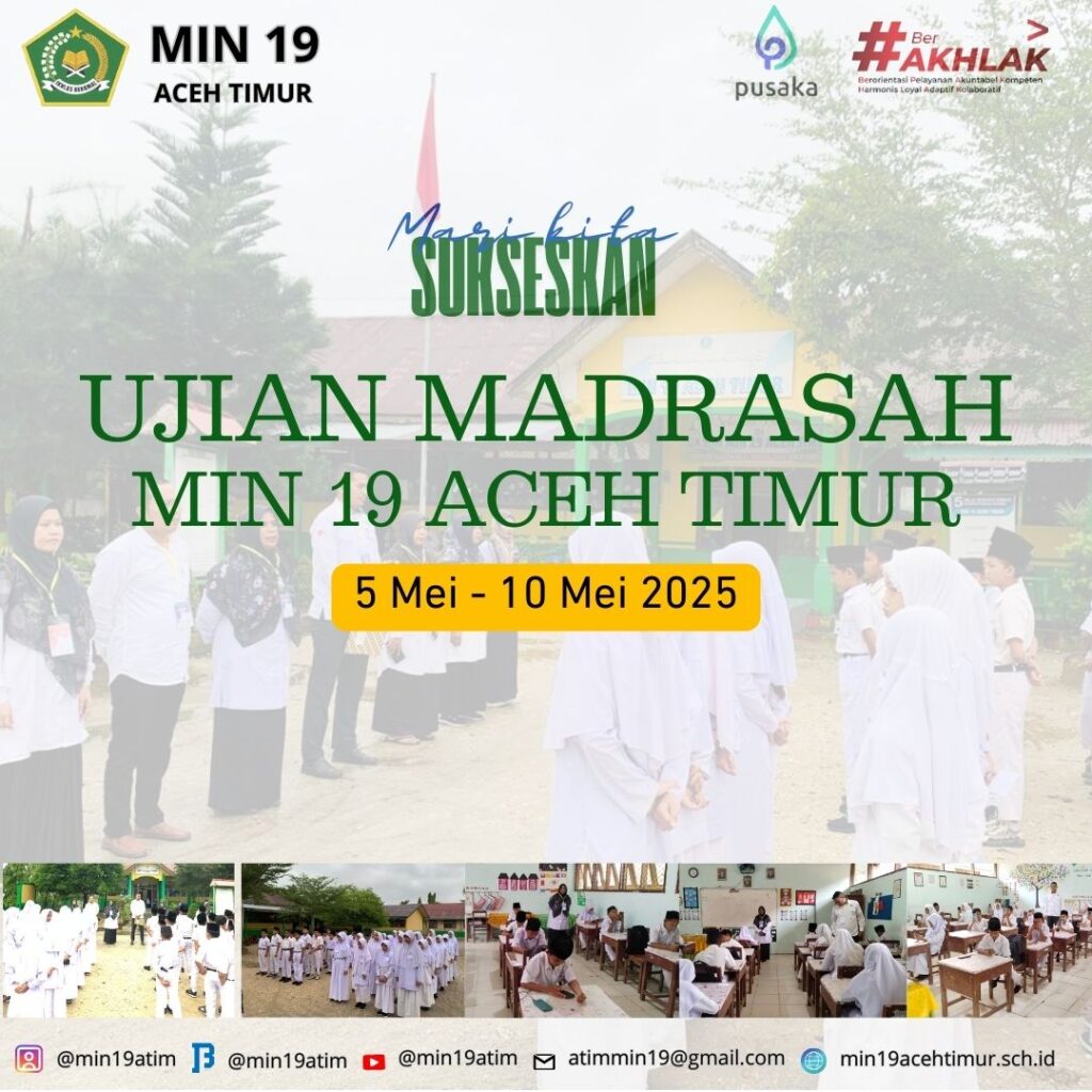 Beusa Seberang, Senin 5 Mei 2025; MIN 19 Aceh Timur akan melaksanakan Ujian Madrasah Tahun Pelajaran 2025 yang dijadwalkan berlangsung mulai tanggal 05 hingga 10 Mei 2025. Ujian ini merupakan evaluasi akhir bagi siswa kelas VI sebelum melanjutkan ke jenjang pendidikan selanjutnya.